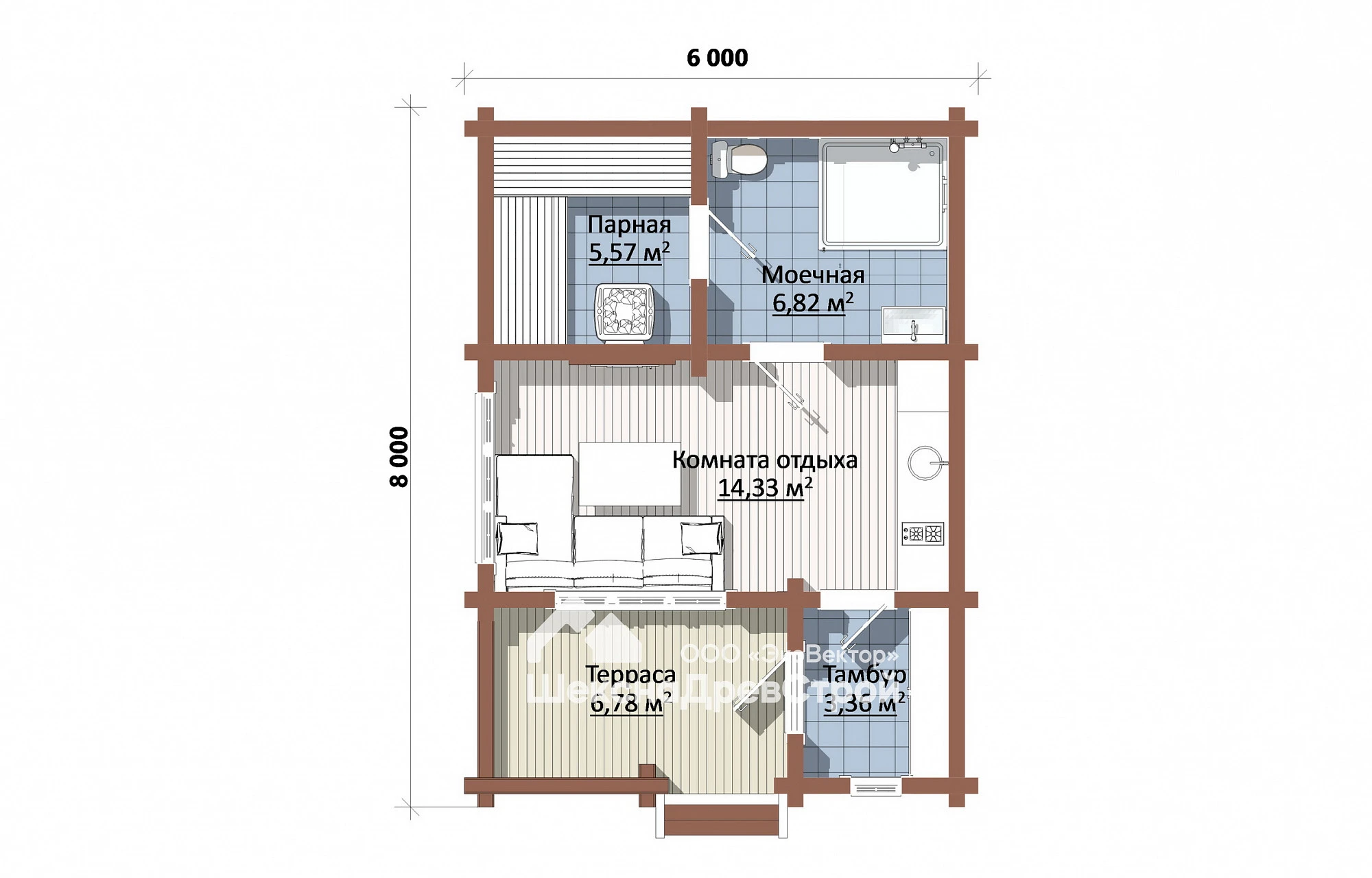 Проект одноэтажной бани из клееного бруса размером 6х8 метров с террасой и просторной комнатой отдыха Бн-15 Северянка, украшенной большими окнами, представляет собой идеальное сочетание функциональности и эстетики. Клееный брус обеспечивает высокую прочность, долговечность и отличную теплоизоляцию конструкции.