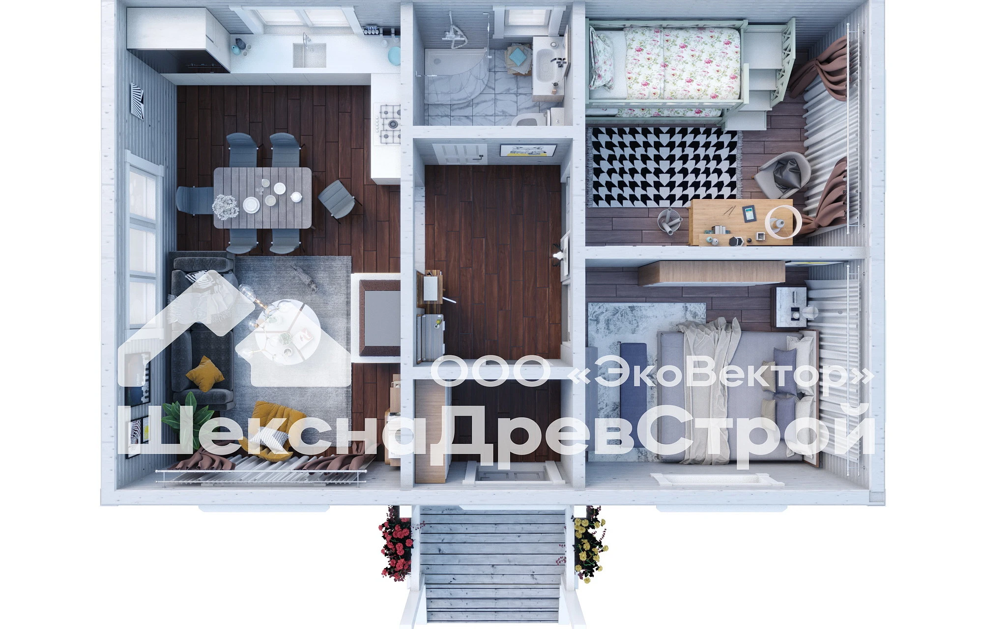 Сердцем дома является не большая гостиная, плавно перетекающая в функциональную кухню. Большие окна пропускают щедрые лучи солнца, наполняя пространство светом и теплом. Две спальни, расположенные в глубине дома, обеспечивают уединенность и покой для отдыха.